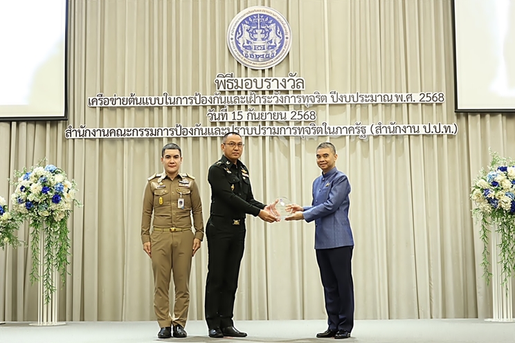 เมื่อวันที่ 15 กันยายน 2568 เวลา 8.30-12.00 น. ณ ห้องแกรนด์บอลรูม A ชั้น5 โรงแรมเบสท์เวสเทิร์น พลัส แวนด้า แกรนด์ ถ.แจ้งวัฒนะ อ.ปากเกร็ด จ.นนทบุรี สำนักงานคณะกรรมการป้องกันและปราบปรามทุจริตในภาครัฐ (สำนักงาน ป.ป.ท.) จัดพิธีมอบรางวัลเครือข่ายต้นแบบในการป้องกันและเฝ้าระวังการทุจริต ประจำปีงบประมาณพ.ศ. 2568 และร่วมจัดนิทรรศการเพื่อนำเสนอผลงานในการป้องกันและเฝ้าระวังการทุจริตของเครือข่าย ซึ่งมีผลงานที่โดดเด่นในการกระตุ้นและสร้างแรงจูงใจให้กับเครือข่ายภาคประชาสังคม ซึ่ง สจร.กอ.รมน.ได้รับรางวัลเครือข่ายต้นแบบในระดับดีเด่นในครั้งนี้ด้วย