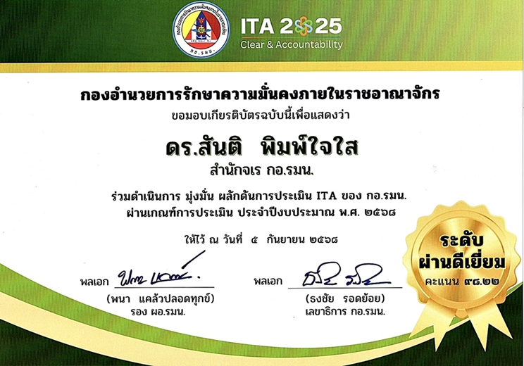 ดร.สันติ พิมพ์ใจใส กล่าวถึงการได้ใบประกาศเกียรติบัตร ITA ครั้งนี้ว่า นับเป็นเกียรติประวัติของตนเอง ที่ได้ร่วมเป็นคณะทำงาน ITA ของ กอ.รมน.จนผ่านเกณฑ์การประเมิน ประจำปีงบประมาน พ.ศ.2568 ระดับผ่านดีเยี่ยม
