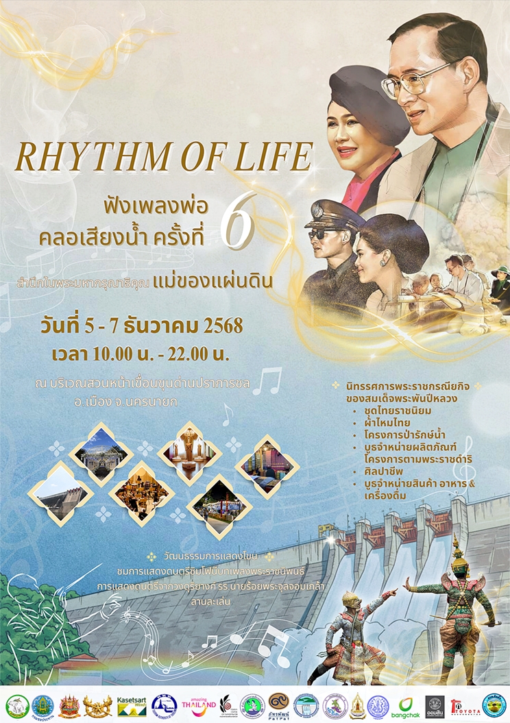 ขอเชิญเที่ยวงานสุดยิ่งใหญ่ของปี และร่วมรำลึกถึงพระมหากรุณาธิคุณ ในงาน “ฟังเพลงพ่อ คลอเสียงน้ำ - Rhythm of Life ครั้งที่ 6”งานนี้ชมฟรี ไม่เสียค่าใช้จ่าย
