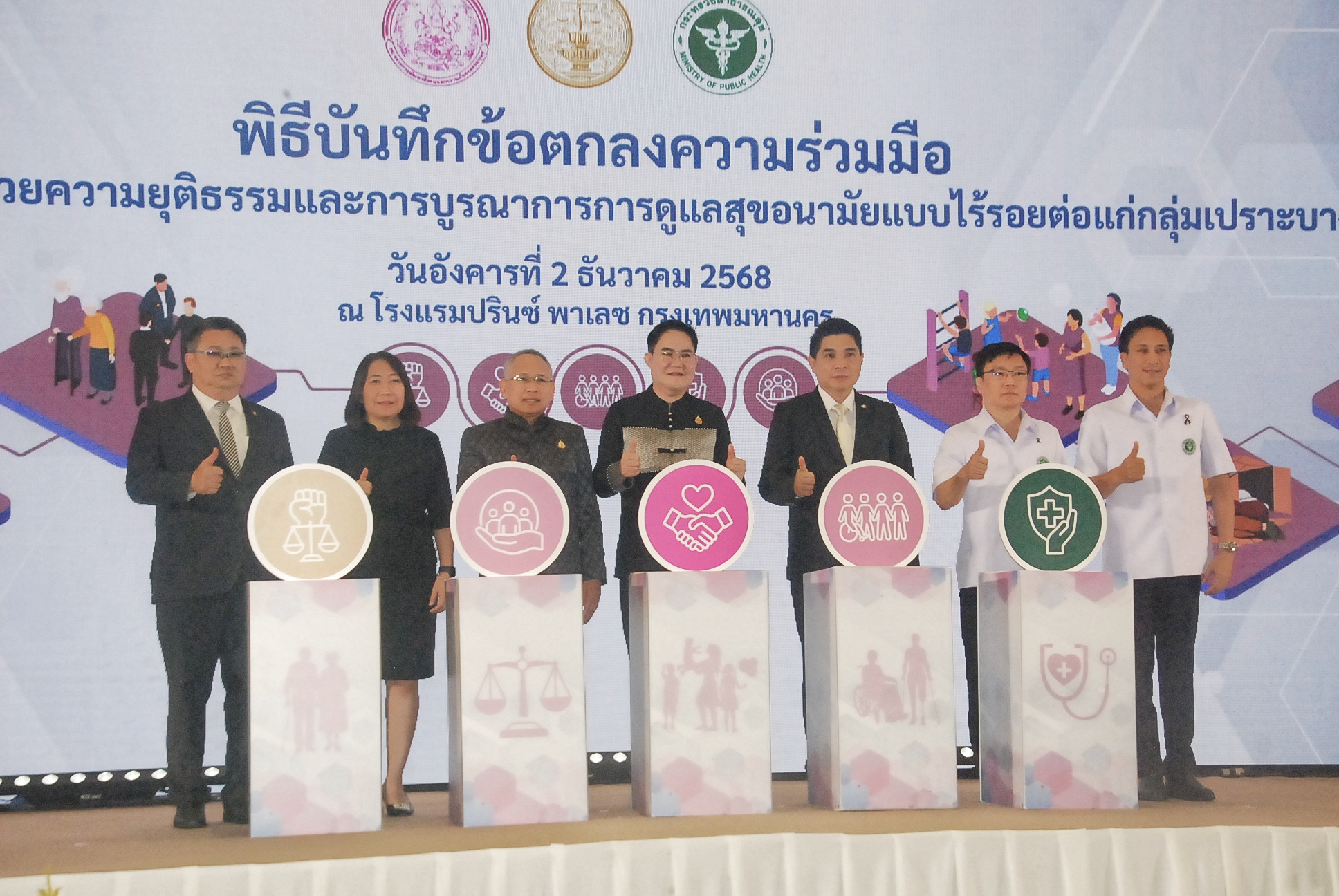 วันที่ 2 ธันวาคม 2568 : นายอัครา พรหมเผ่า รัฐมนตรีว่าการกระทรวงการพัฒนาสังคมและความมั่นคงของมนุษย์ (รมว.พม.) เป็นประธานในพิธีลงนามบันทึกข้อตกลงความร่วมมือ (MOU) ว่าด้วยการอำนวยความยุติธรรมและการบูรณาการการดูแลสุขอนามัยแบบไร้รอยต่อแก่กลุ่มเปราะบาง ระหว่างกระทรวงการพัฒนาสังคมและความมั่นคงของมนุษย์ (พม.) กระทรวงยุติธรรม (ยธ.) และกระทรวงสาธารณสุข (สธ.) พร้อมทั้งเปิดกิจกรรม Kick off การอำนวยความยุติธรรมและการบูรณาการการดูแลสุขอนามัยแบบไร้รอยต่อแก่กลุ่มเปราะบาง