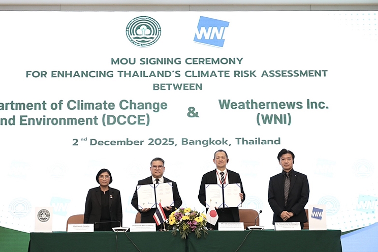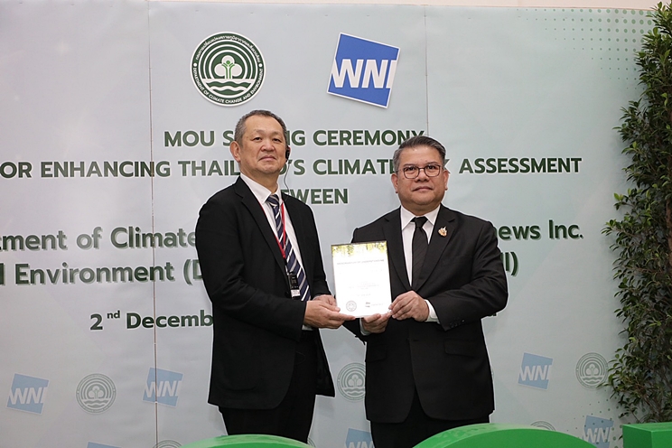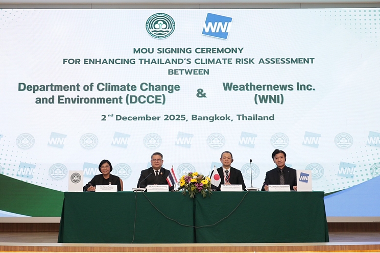 เมื่อวันที่ 2 ธันวาคม 2568 กระทรวงทรัพยากรธรรมชาติและสิ่งแวดล้อม โดยกรมการเปลี่ยนแปลงสภาพภูมิอากาศและสิ่งแวดล้อม (สส.) ได้ลงนามบันทึกความร่วมมือว่าด้วยการเสริมสร้างศักยภาพการประเมินความเสี่ยงจากการเปลี่ยนแปลงสภาพภูมิอากาศของประเทศไทย ระหว่าง กรมการเปลี่ยนแปลงสภาพภูมิอากาศและสิ่งแวดล้อม โดย นายปวิช เกศววงศ์ รองอธิบดีกรมการเปลี่ยนแปลงสภาพภูมิอากาศและสิ่งแวดล้อม ได้รับมอบหมายจาก ดร. พิรุณ สัยยะสิทธิ์พานิช อธิบดีกรมการเปลี่ยนแปลงสภาพภูมิอากาศและสิ่งแวดล้อม และ บริษัท เวเธอร์นิวส์ จำกัด โดยนายทาคามุเนะ ซูซุกิ ประธานเจ้าหน้าที่บริหารฝ่ายธุรกิจเทคโนโลยีสภาพภูมิอากาศ บริษัท เวเธอร์นิวส์ จำกัด และนายมาซาจิกะ นิชิบายาชิ ประธานกรรมการบริษัท เวเธอร์นิวส์ (ประเทศไทย) จำกัด เป็นสักขีพยาน และได้รับเกียรติจากนางสาวยูริเอะ โอซาวะ เลขานุการเอกสถานเอกอัครราชทูตญี่ปุ่นประจำประเทศไทย ร่วมกล่าวแสดงความยินดี ณ ห้องประชุมอารีย์สัมพันธ์ อาคารกรมการเปลี่ยนแปลงสภาพภูมิอากาศและสิ่งแวดล้อม
