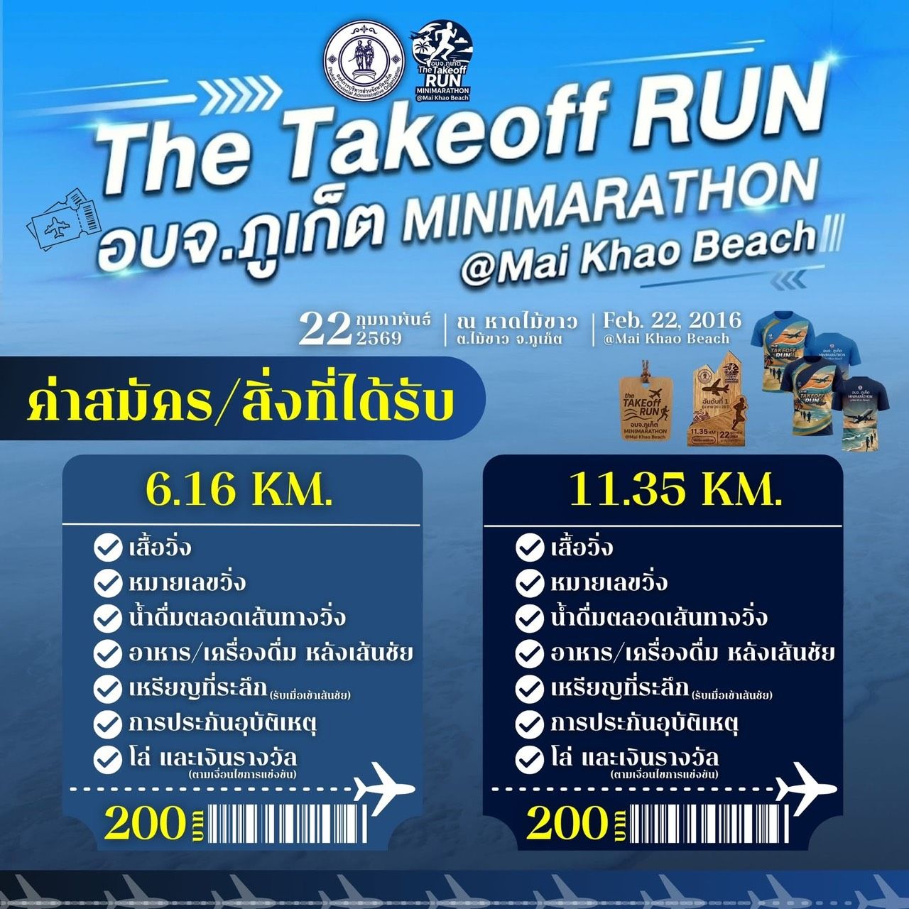 กิจกรรม “The Takeoff RUN มีความพิเศษซึ่งนักกีฬาจะได้สัมผัสเส้นทางวิ่งริมทะเล ผ่านพื้นที่อุทยาน ลอดใต้ปีกเครื่องบิน รันเวย์ธรรมชาติหนึ่งเดียวในไทย (จุดชมเครื่องบินขึ้น-ลงที่มีชื่อเสียงระดับโลก) ในราคาเพียง 200 บาท ทุกระยะ ที่สำคัญ ในค่าสมัคร 200 บาท นี้ ผู้ร่วมแข่งขันจะได้รับ เสื้อ วิ่งสวยๆ / คูปองอาหาร (สำหรับผู้ร่วมวิ่งเท่านั้น)
