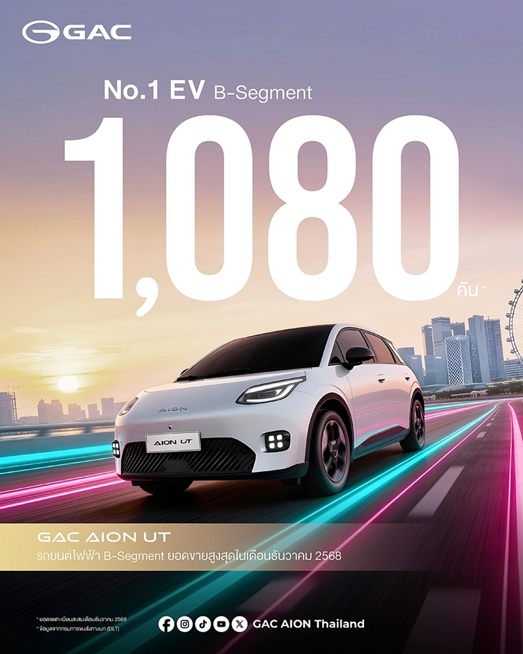 GAC AION UT คว้ายอดขายอันดับ 1 กลุ่มรถยนต์ไฟฟ้า B-Segment เดือนธันวาคม 2568 รวมทั้งสิ้น 1,080 คัน