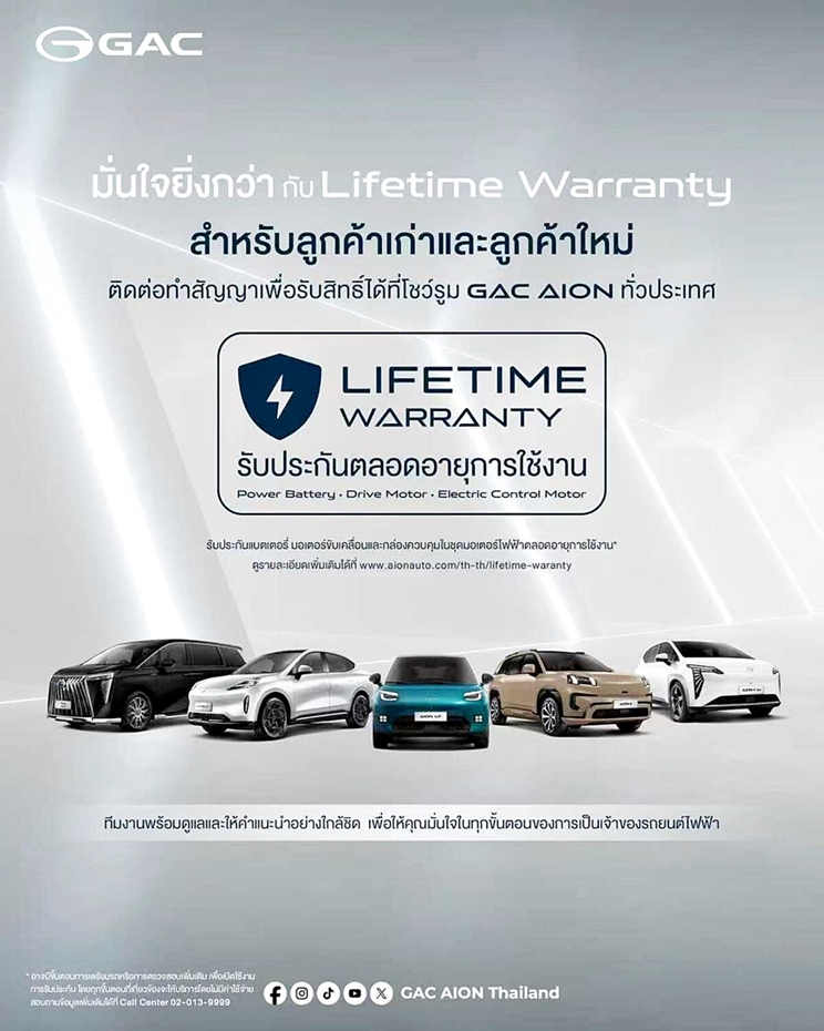 เพื่อเป็นการยกระดับความเชื่อมั่นในคุณภาพของรถยนต์ไฟฟ้าและสร้างความมั่นใจสูงสุดให้แก่ลูกค้า GAC AION Thailand ได้มอบสิทธิ์ LIFETIME WARRANTY รับประกันแบตเตอรี่, มอเตอร์ขับเคลื่อน, และกล่องควบคุมในชุดมอเตอร์ไฟฟ้า ตลอดอายุการใช้งาน เพื่อให้ลูกค้าได้ใช้งานรถยนต์ไฟฟ้าของ GAC AION ได้อย่างอุ่นใจและไร้กังวลตลอดอายุการใช้งาน ซึ่งถือเป็นความตั้งใจของ GAC AION Thailand ในการส่งมอบบริการหลังการขายที่ยอดเยี่ยมและสร้างความพึงพอใจที่เหนือกว่าให้แก่ผู้ใช้งานชาวไทยทุกคน