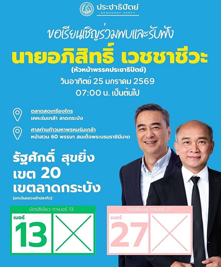 วันที่ 25 มกราคม 2569 พรรคประชาธิปัตย์ นำโดย นายอภิสิทธิ์ เวชชาชีวะ หัวหน้าพรรค ประชาธิปัตย์ พร้อมด้วย นายสกลธี ภัททิยกุล รองหัวหน้าพรรค ลงพื้นที่เขตลาดกระบัง กรุงเทพมหานคร เพื่อร่วมช่วยหาเสียงและพบปะประชาชน สนับสนุนการทำงานของ นายรัฐศักดิ์ สุขยิ่ง ผู้สมัครสมาชิกสภาผู้แทนราษฎรกรุงเทพมหานคร เขต 20 เขตลาดกระบัง (ยกเว้นแขวงลำปลาทิว) พรรคประชาธิปัตย์