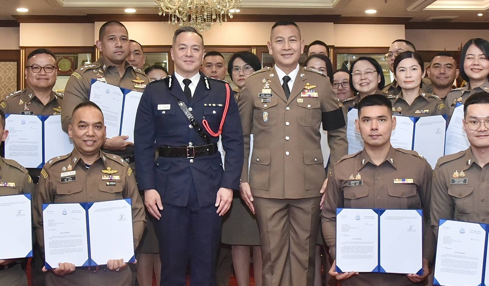 นอกจากนี้ ผบ.ตร.ฮ่องกง ยังกล่าวชื่นชมและขอบคุณเป็นพิเศษ ต่อกรณีล่าสุดที่สำนักงานตำรวจแห่งชาติไทยสามารถจับกุมผู้ต้องหาคดีฆาตกรรม ซึ่งหลบหนีมาใช้ชีวิตอยู่ในประเทศไทยเป็นระยะเวลานานได้สำเร็จ โดยถือเป็นอีกหนึ่งบทพิสูจน์ของความร่วมมือด้านการข่าว การสืบสวน และการบังคับใช้กฎหมายระหว่างประเทศที่มีประสิทธิภาพสูงในโอกาสเดียวกันนี้ ผบ.ตร.ฮ่องกง ได้มอบหนังสือแสดงความขอบคุณอย่างเป็นทางการ พร้อมเหรียญที่ระลึก ให้แก่เจ้าหน้าที่ตำรวจตรวจคนเข้าเมืองไทยจำนวน 28 นาย นำโดย พ.ต.อ.พงศ์ธร พงศ์รัชตนันทน์ รองผู้บังคับการตรวจคนเข้าเมือง 2 , พ.ต.อ.ณัฐกิตติ์ มีสุข ผกก.ตม.จว.ปทุมธานี (เมื่อครั้งดำรงตำแหน่ง ผกก.สส.ปป.บก.ตม.2) , พ.ต.อ.เนาวรัตน์ เฉลิมศรี ผกก.ฝ่ายตรวจคนเข้าเมืองขาเข้า ด่าน ตม.ทอ.สุวรรณภูมิ , พ.ต.อ.กฤษณ์ ฉัตรทวี ผกก.ฝ่ายพิธีการเข้าเมือง ด่าน ตม.ทอ.สุวรรณภูมิ เพื่อเป็นเกียรติและขวัญกำลังใจแก่ผู้ปฏิบัติงาน ซึ่งเป็นกำลังสำคัญในการสกัดกั้นอาชญากรรมข้ามชาติและปกป้องความมั่นคงของประเทศ