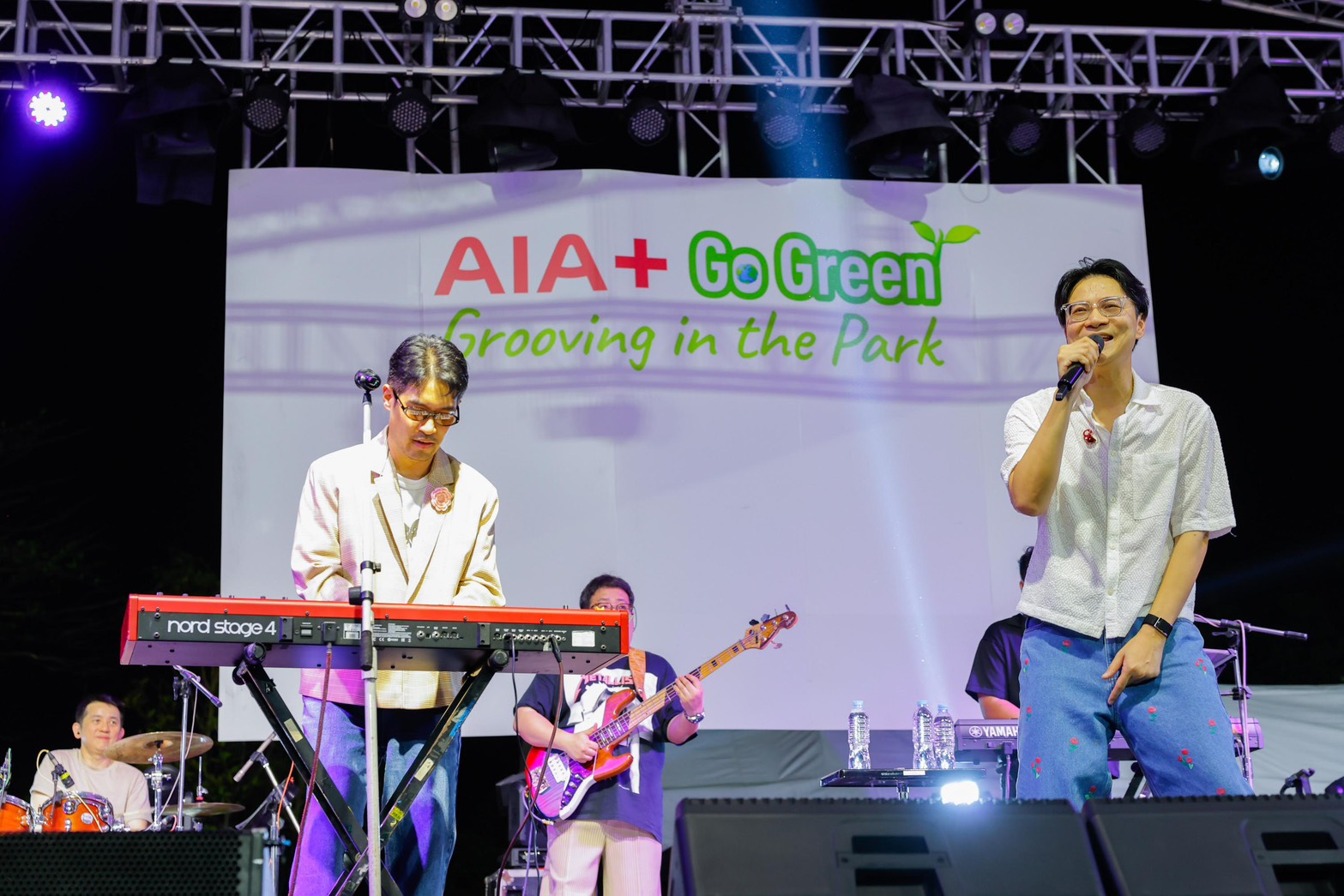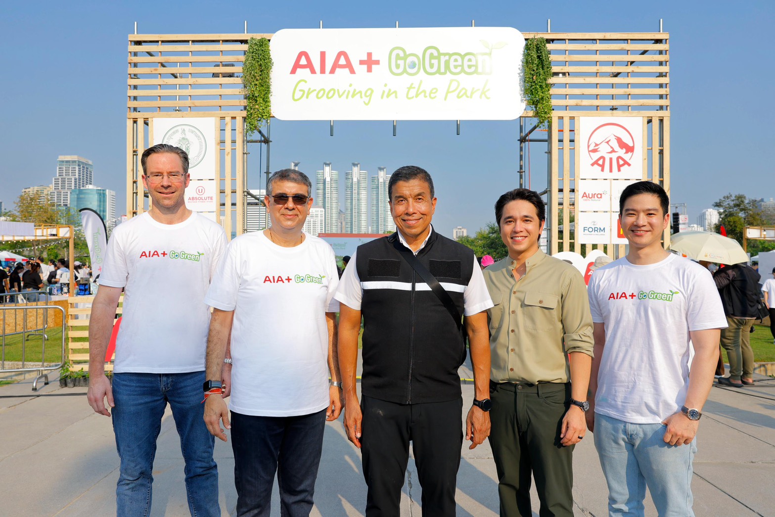 เอไอเอ ประเทศไทย นำโดย นายนิคฮิล แอดวานี ประธานเจ้าหน้าที่บริหาร ดร. คริสเตียน โรแลนด์ ประธานเจ้าหน้าที่ฝ่ายกลยุทธ์และดิจิทัล และ นายจุฑาภัทร เหล่าธรรมทัศน์ ผู้อำนวยการฝ่ายพัฒนา ดิจิทัล โซลูชันส์ แอนด์ ดีไซน์ เอไอเอ เวลเนส พร้อมด้วย นายชัชชาติ สิทธิพันธุ์ ผู้ว่าราชการกรุงเทพมหานคร และ นายอเล็กซ์ เรนเดลล์ ประธานกรรมการบริหาร ศูนย์สิ่งแวดล้อมศึกษา (EEC) ร่วมเปิดงาน AIA+ Go Green Festival – Grooving in the Park เฉลิมฉลองความสำเร็จในพันธกิจการดูแลสุขภาพ ควบคู่การขับเคลื่อนสังคมสู่ความยั่งยืน ณ สวนเบญจกิติ