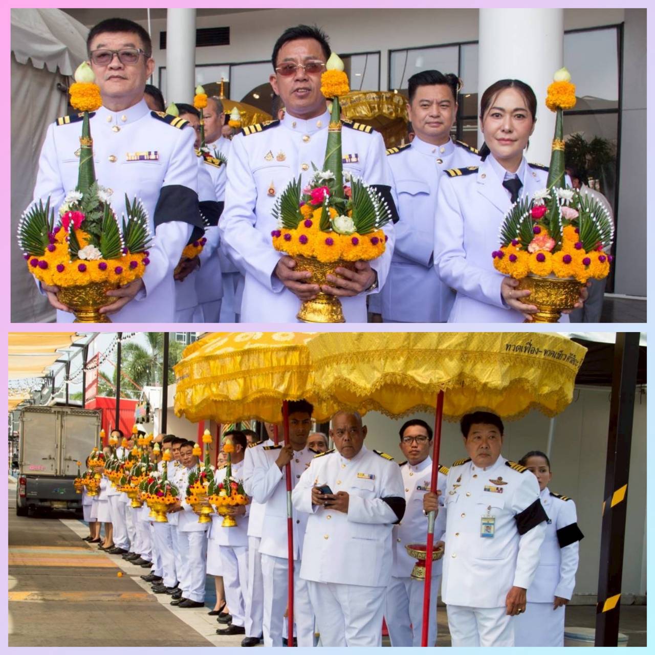 • ดร. ประกาย ณ สงขลา ถวายพานพุ่ม อัญเชิญเครื่องสูง เบื้องซ้ายเบื้องขวา