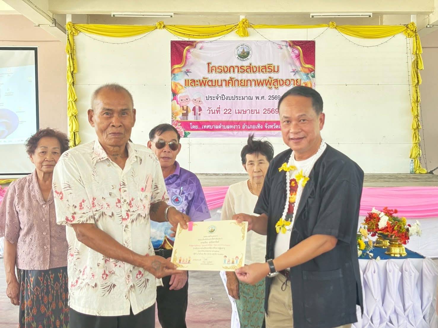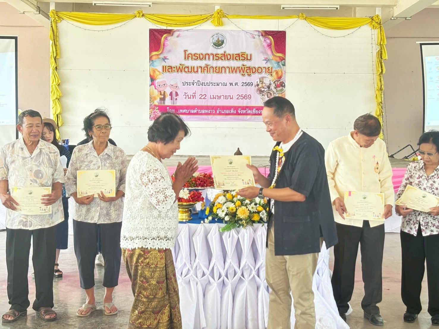 วันที่ 22 เมษายน 2569 ที่ผ่านมา ว่าที่ พ.ต.ต.วรเมธ ธรรมจันตา นายกเทศมนตรีตำบลหงาว อำเภอเทิง จังหวัดเชียงราย เป็นประธานเปิดโครงการส่งเสริมและพัฒนาศักยภาพผู้สูงอายุประจำปีงบประมาณ พ.ศ. 2569 ณ อาคารศูนย์บริการท่องเที่ยวกลุ่มจังหวัดภาคเหนือ ตอนบน 2 จว.เชียงราย เพื่อส่งเสริมให้ความรู้เรื่องการส่งเสริมสุขภาพตามหลัก 5 อ. (อาหาร ออกกำลังกาย อารมณ์ เอนกายพักผ่อน อนามัย/อดิเรก) ให้ผู้สูงอายุมีความรู้เกี่ยวกับการพัฒนาสุขภาพกาย สุขภาพจิต และสามารถดูแลสุขภาพของตนเองเบื้องต้นได้ เพื่อส่งเสริมให้ผู้สูงอายุมีการวางแผนการดำเนินชีวิต มีความรู้ความเข้าใจ และมีการเตรียมความพร้อมเข้าสู่สังคมผู้สูงวัยเต็มรูปแบบ เพื่อส่งเสริมความกตัญญู รู้คุณต่อผู้สูงอายุ การสร้างขวัญกำลังใจ และสร้างความรู้สึกมีคุณค่าให้ผู้สูงอายุ ได้ทำกิจกรรมร่วมกัน ลดความเหงาและภาวะซึมเศร้า โดยมีวิทยากรจากโรงพยาบาลเทิงมาอบรมให้ความรู้เรื่อง การกินอาหารตามวัยใส่ใจสุขภาพ การบริโภคโดยนำสมุนไพรใกล้ตัวมาประกอบอาหาร และใช้เป็นยารักษาโรค