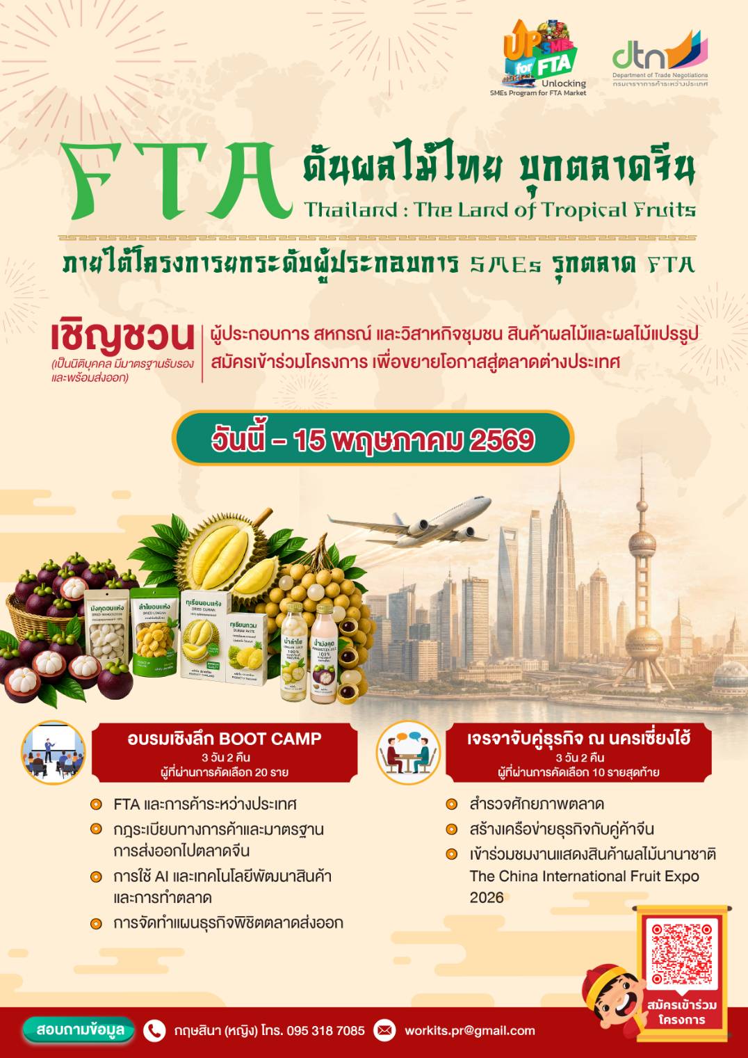 พลาดไม่ได้! กับโอกาสสำคัญเป็นส่วนหนึ่งของการ “ยกระดับธุรกิจผลไม้ไทยสู่ตลาดโลกด้วย FTA” สมัครเข้าร่วมโครงการฟรีได้ที่ https://shorturl.asia/760yn ตั้งแต่วันนี้ - 15 พฤษภาคม 2569 หรือสอบถามรายละเอียดเพิ่มเติม โทร. 095-318-7085